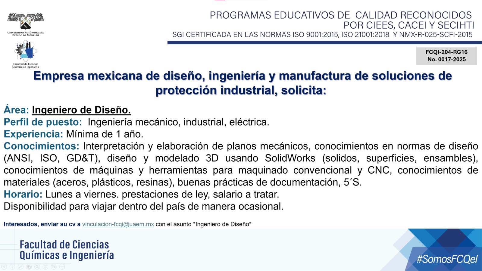 Bolsa de trabajo Empresa mexicana de diseño, ingeniería y manufactura de soluciones de protección industrial Ver más 13 noviembre, 2025